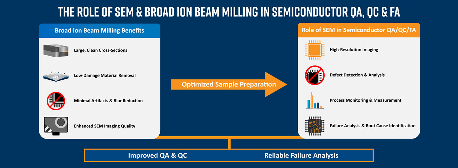 Sample preparation is a critical enabler of effective SEM-based QA, QC, and failure analysis in semiconductor manufacturing. It directly impacts image quality, measurement accuracy, and the reliability of conclusions drawn from SEM data. Broad ion beam milling is a highly effective sample preparation technique for SEM-based QA, QC, and failure analysis in semiconductor manufacturing since it preserves nanoscale features and interfaces while minimizing artifacts. It also produces large area representative cross-sections that enable access to buried structures essential for failure analysis. The SEMPREP SMART broad ion beam milling system delivers a combination of precision, automation, and flexibility tailored to the demanding requirements of semiconductor SEM sample preparation.