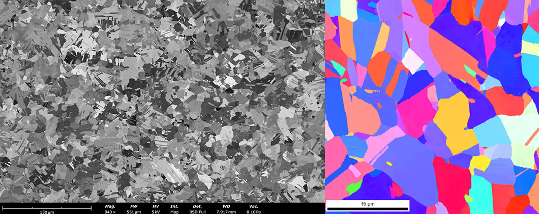 Surface polishing is typically used for flat or epoxy mounted samples to remove a larger portion of the damaged or contaminated layer to create a clean / smooth surface for imaging. One of the most common applications of this technique is to polish the sample surface for EBSD analysis. By polishing metallic or mineral samples, internal crystalline areas, known as grains, can be revealed. Figure 2 compares a sample of copper foil before and after ion mill polishing, both with corresponding EBSD data.1 The grains are immediately identifiable after ion milling and result in a beautiful EBSD mosaic. Analyzing these structures with EBSD reveals much about a sample through analysis of crystal orientation.1 Revealing these grains can be painstaking work with only traditional polishing techniques, especially for hard materials such as high entropy alloys. Ion milling is an ideal technique for these applications as it significantly reduces the workload on the researcher, is more cost effective, and provides higher quality results. Thus, many different industries look to use ion milling for their EBSD sample preparation including those researching semiconductors, batteries, and geologic materials.