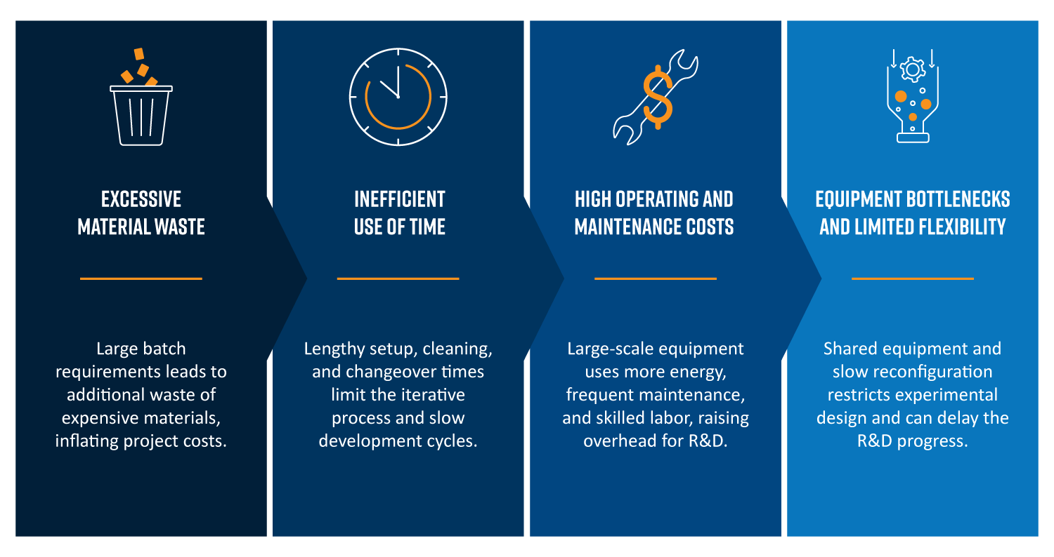 Relying on pilot-scale or production-scale equipment for R&D introduces a host of hidden costs that extend beyond the immediate expense of operation. These systems, while well-suited for manufacturing, are fundamentally misaligned with the small-batch, iterative nature of research. The result is an accumulation of inefficiencies, ranging from excessive material waste and prolonged setup times to reduced flexibility, and high operating overhead, that can significantly hinder both innovation and resource allocation.