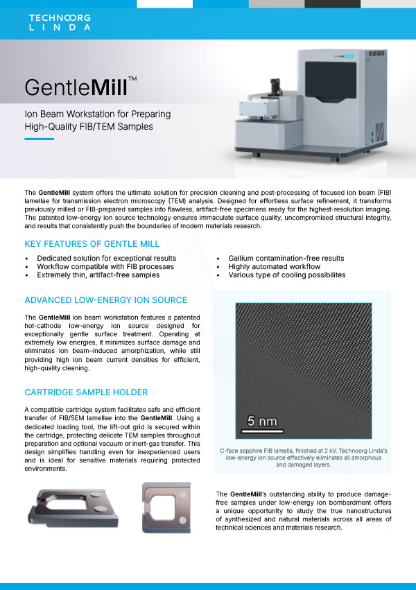 The GentleMill system offers the ultimate solution for precision cleaning and post-processing of focused ion beam (FIB) lamellae for transmission electron microscopy (TEM) analysis. Designed for effortless surface refinement, it transforms previously milled or FIB-prepared samples into flawless, artifact-free specimens ready for the highest-resolution imaging. The patented low-energy ion source technology ensures immaculate surface quality, […]