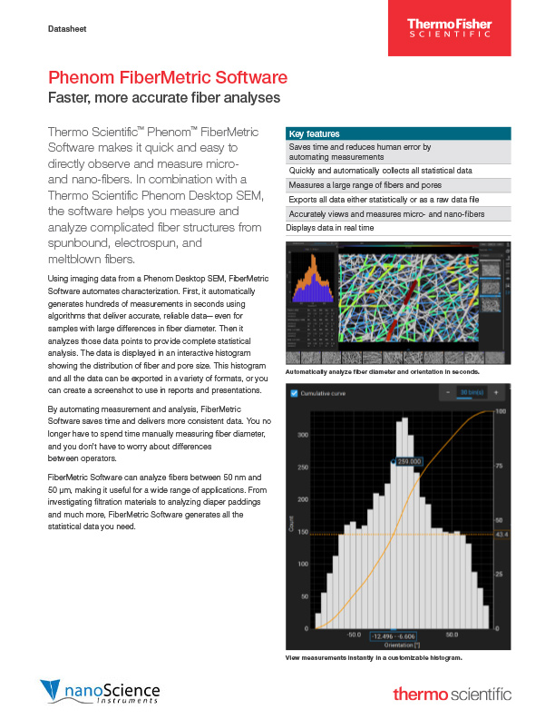 Thermo Scientific™ Phenom™ FiberMetric Software makes it quick and easy to directly observe and measure microand nano-fibers. In combination with a Thermo Scientific Phenom Desktop SEM, the software helps you measure and analyze complicated fiber structures from spunbound, electrospun, and meltblown fibers.